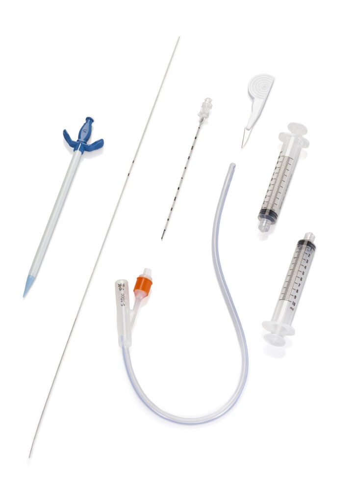 Complete Kit: The system is supplied as a sterile, cost-effective kit that includes a needle, guidewire, sheath dilator, silicone Foley catheter, scalpel, and two syringes.
